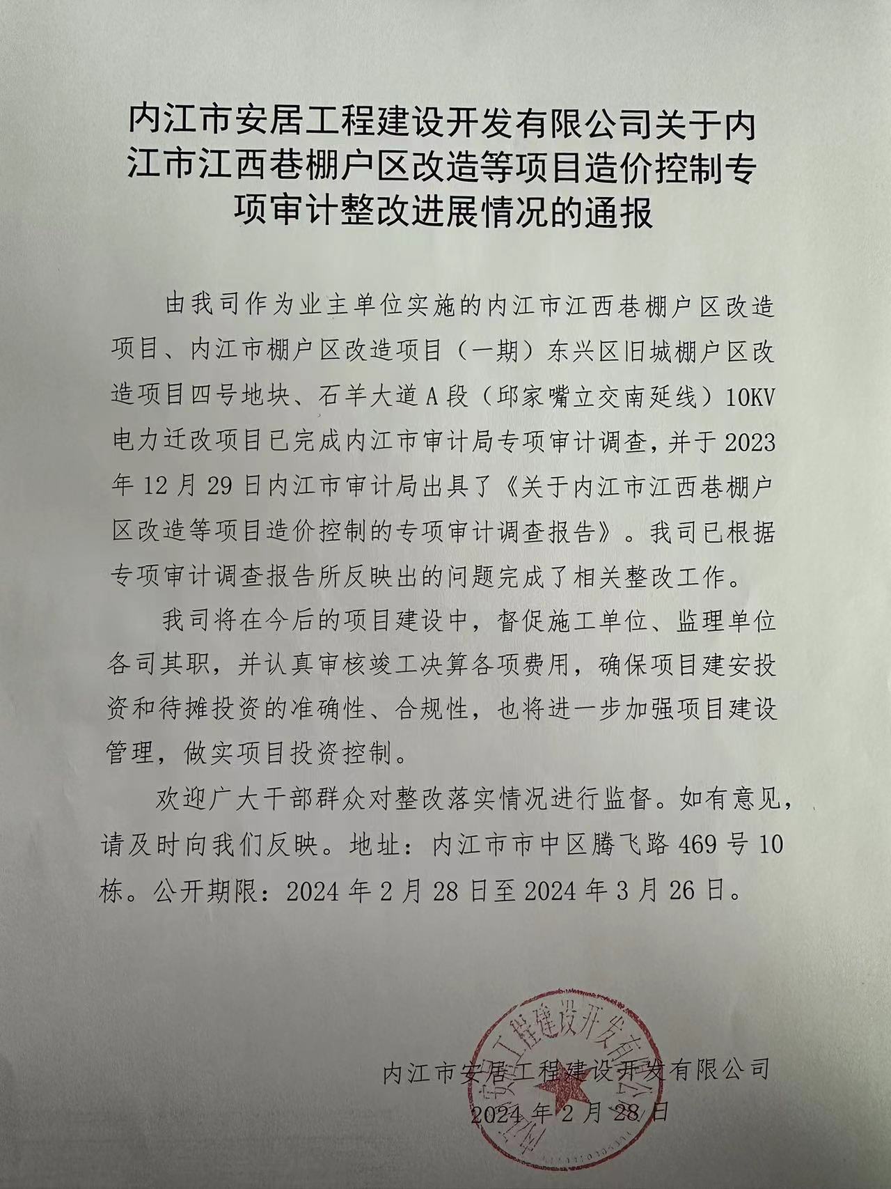江西巷棚戶區改造等項目造價控制專項審計整改進展情況的通報